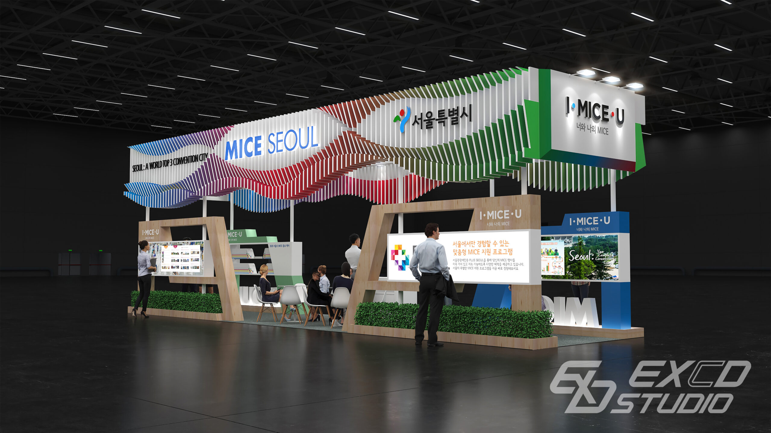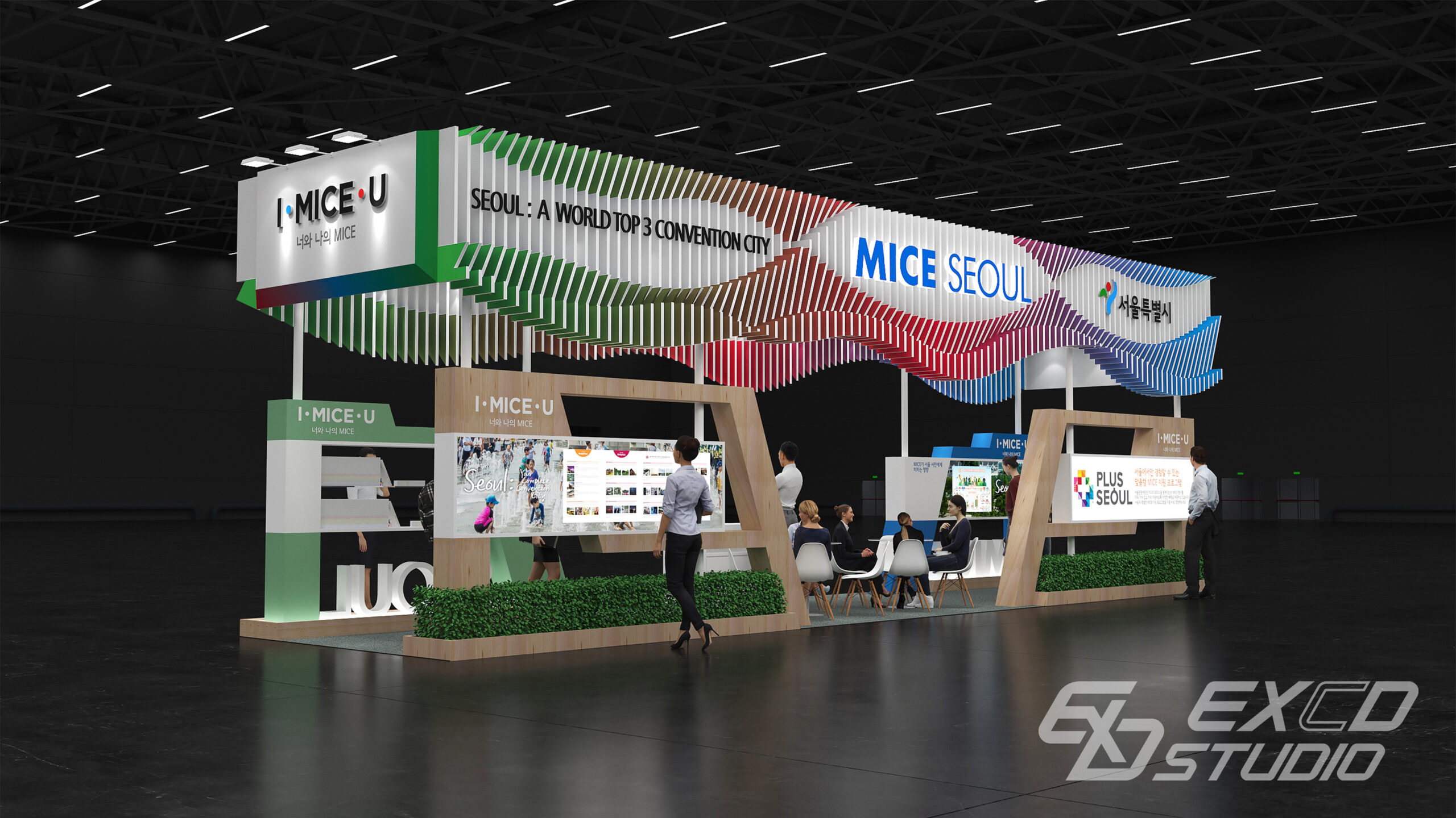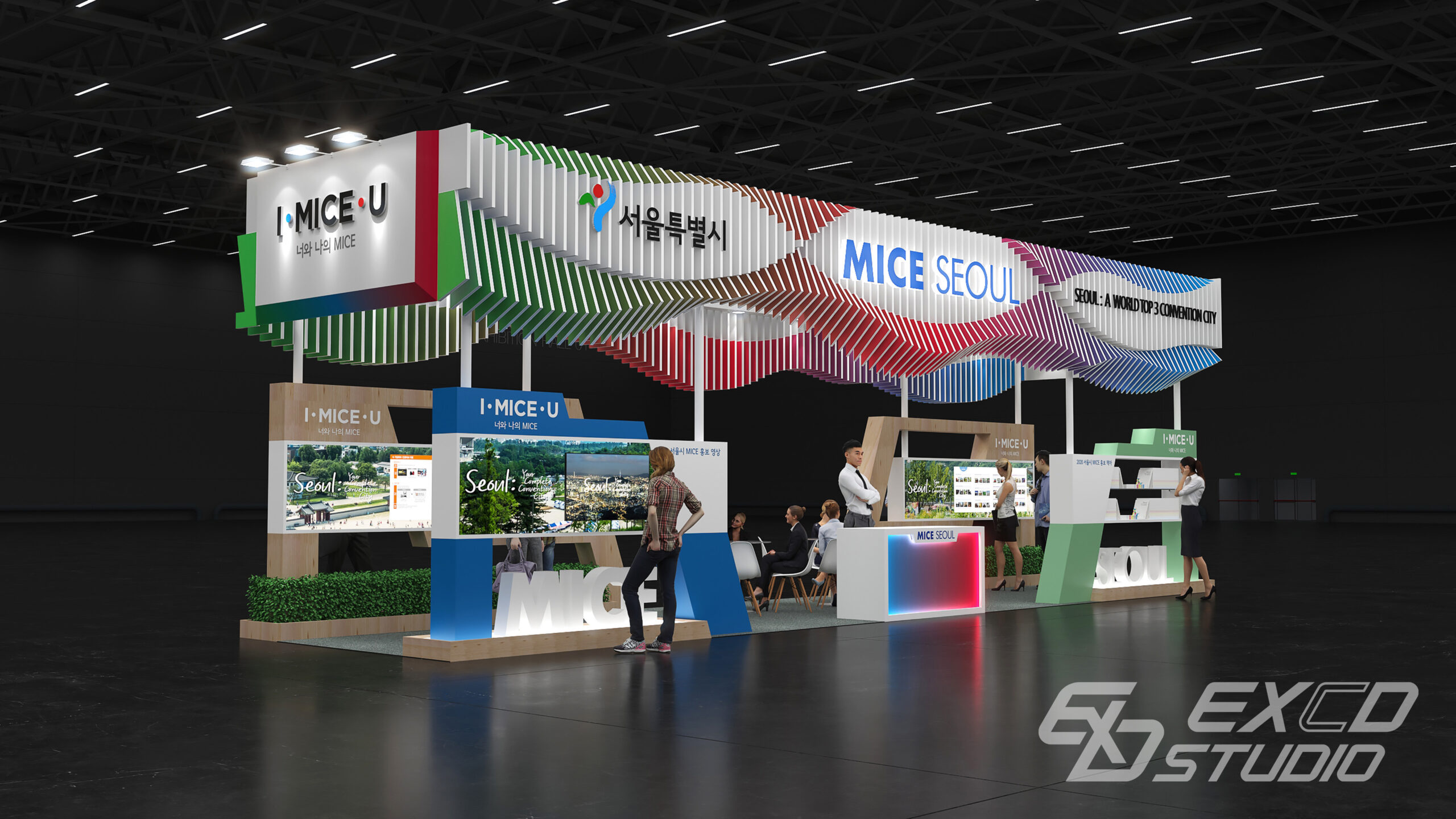 서울시 전시디자인 공모전에서 우수상을 수상한 작품으로, 형태가 서로 다른 패널을 연속적으로 배치한 상부 구조물을 통해 한강의 흐름을 형상화했습니다. 패널 양면에 서로 다른 그라데이션 컬러를 적용하여 시점의 변화에 따라 다양한 분위기와 역동성을 느낄 수 있도록 계획했습니다.