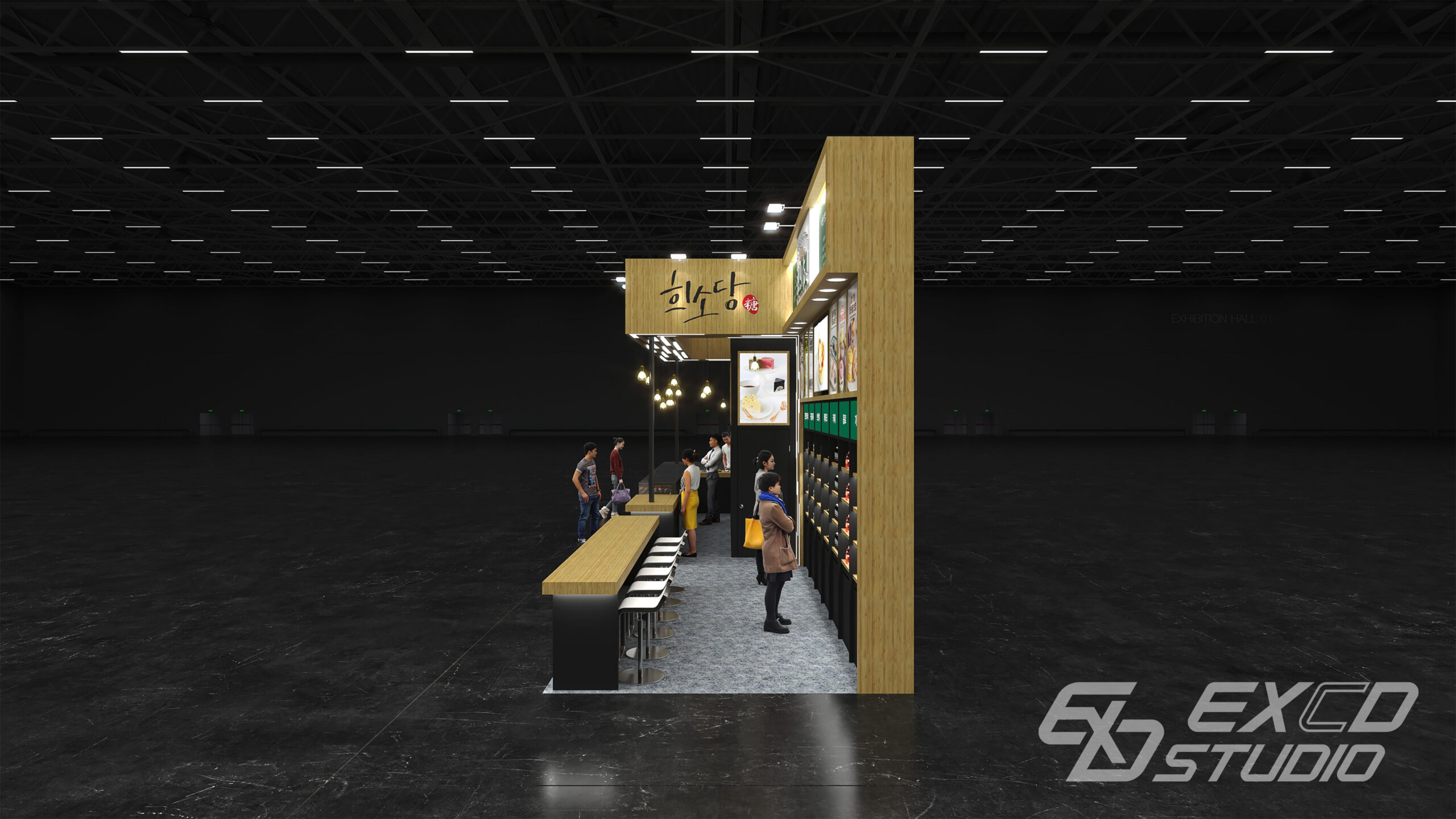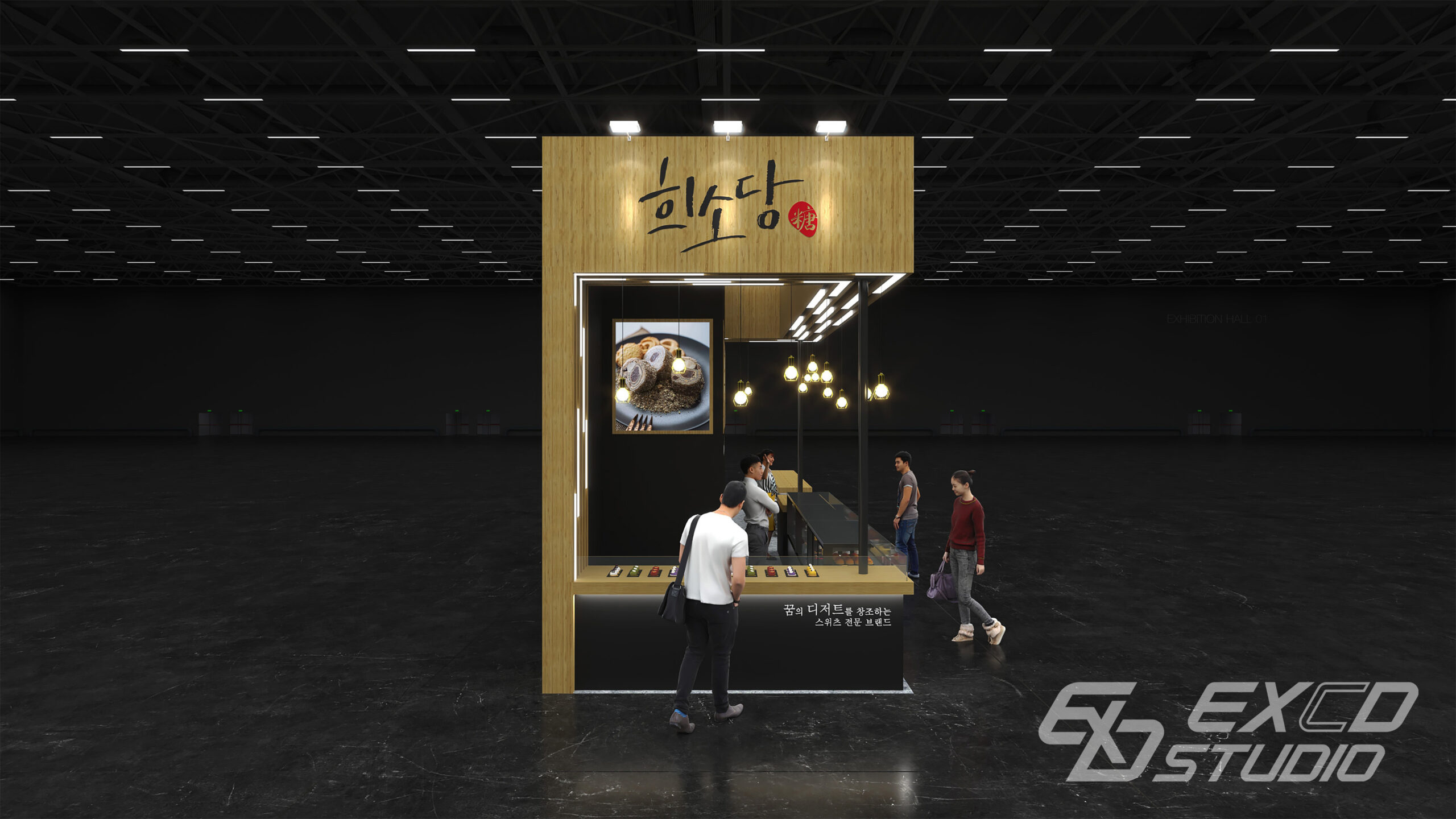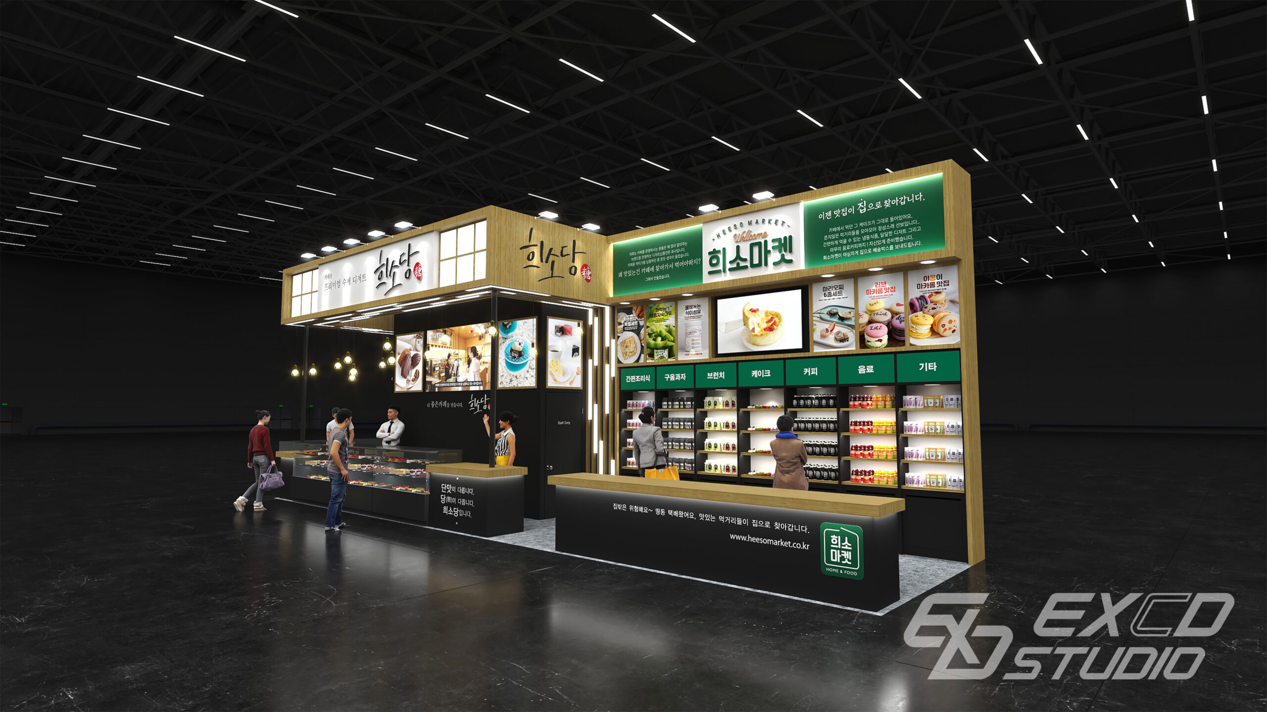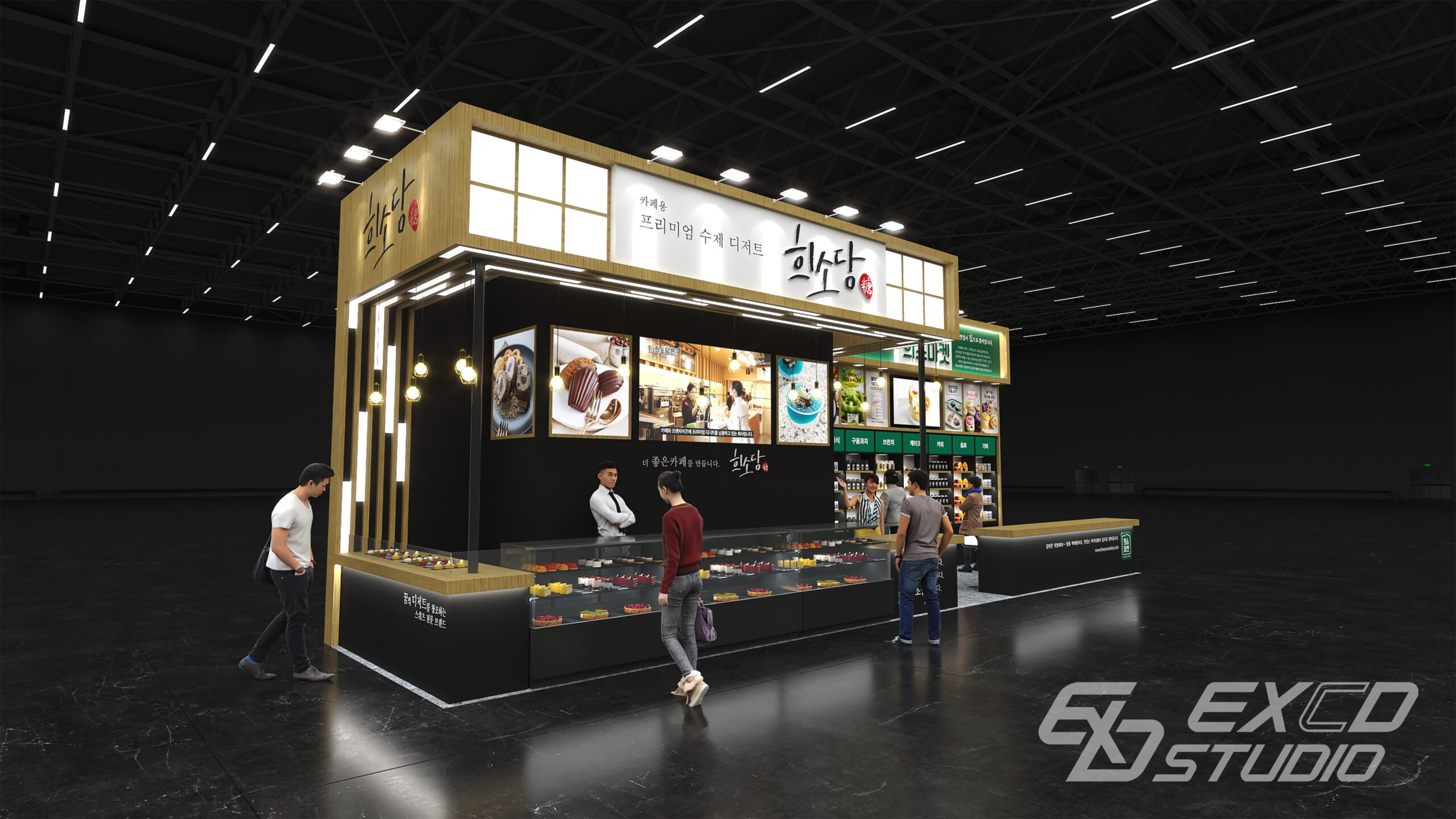 우드 소재와 다양한 조명 연출을 활용해 카페와 같은 분위기를 연출하고 브랜드의 프리미엄 디저트 이미지를 공간에 반영했습니다. 전면에는 디저트 쇼케이스를 배치해 제품의 시인성을 높이고 측면에는 제품 진열 공간을 구성해 방문객이 자연스럽게 제품을 살펴볼 수 있도록 했습니다.