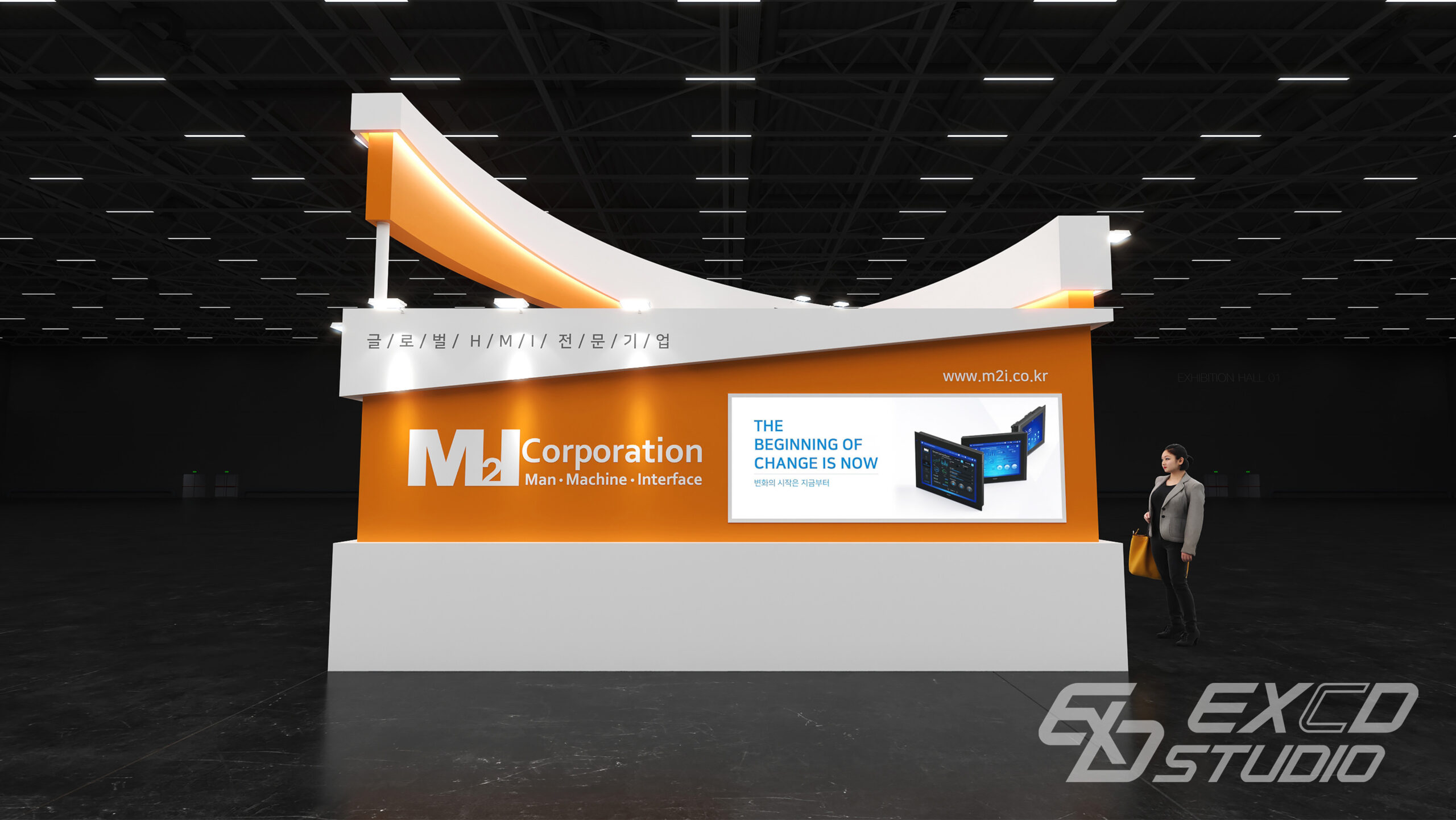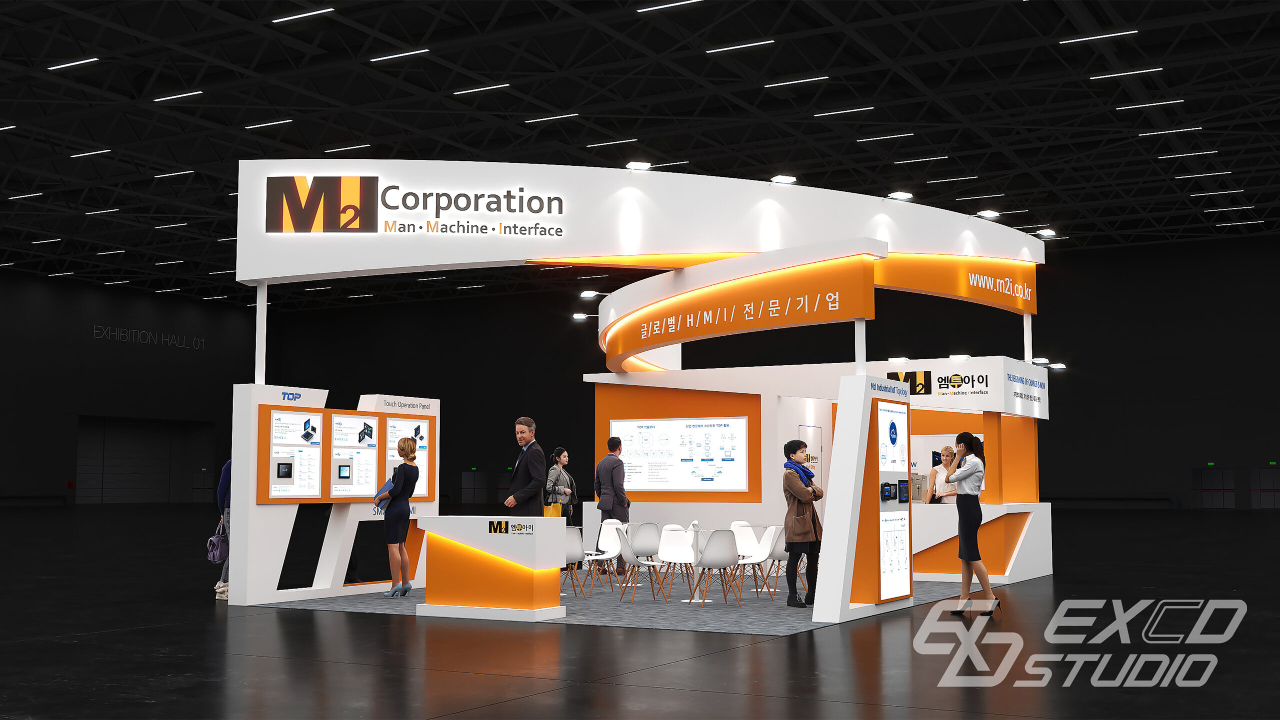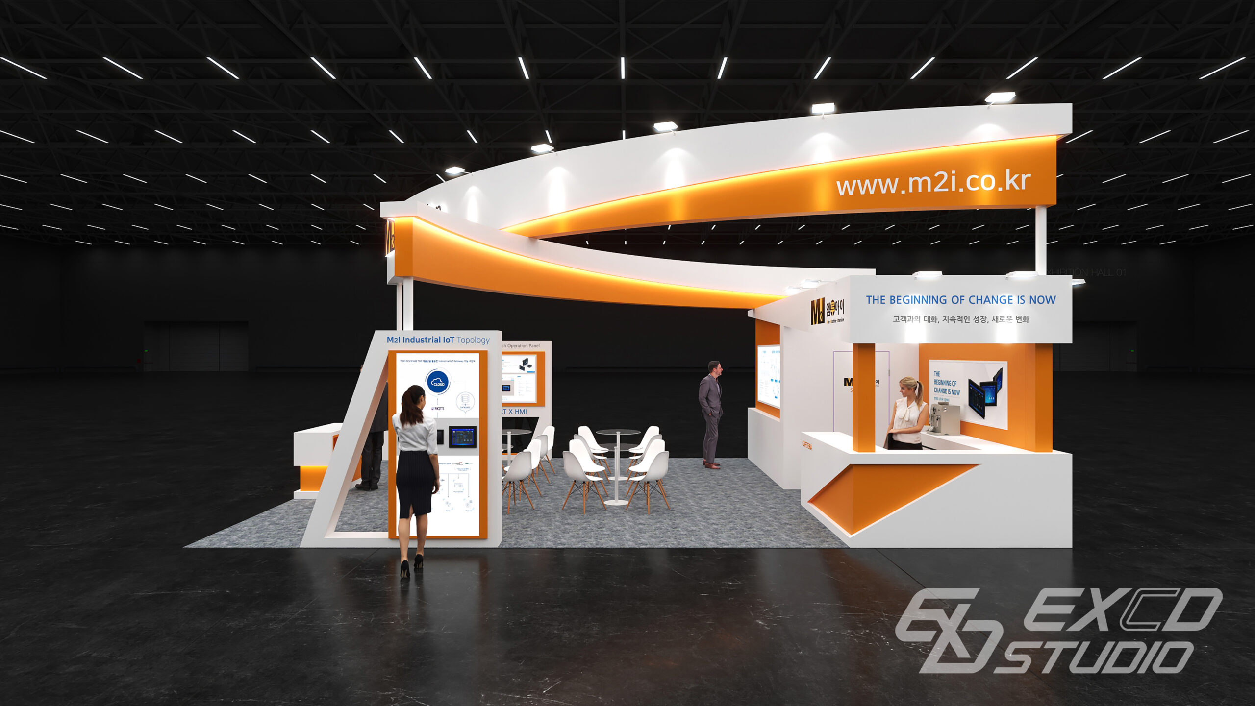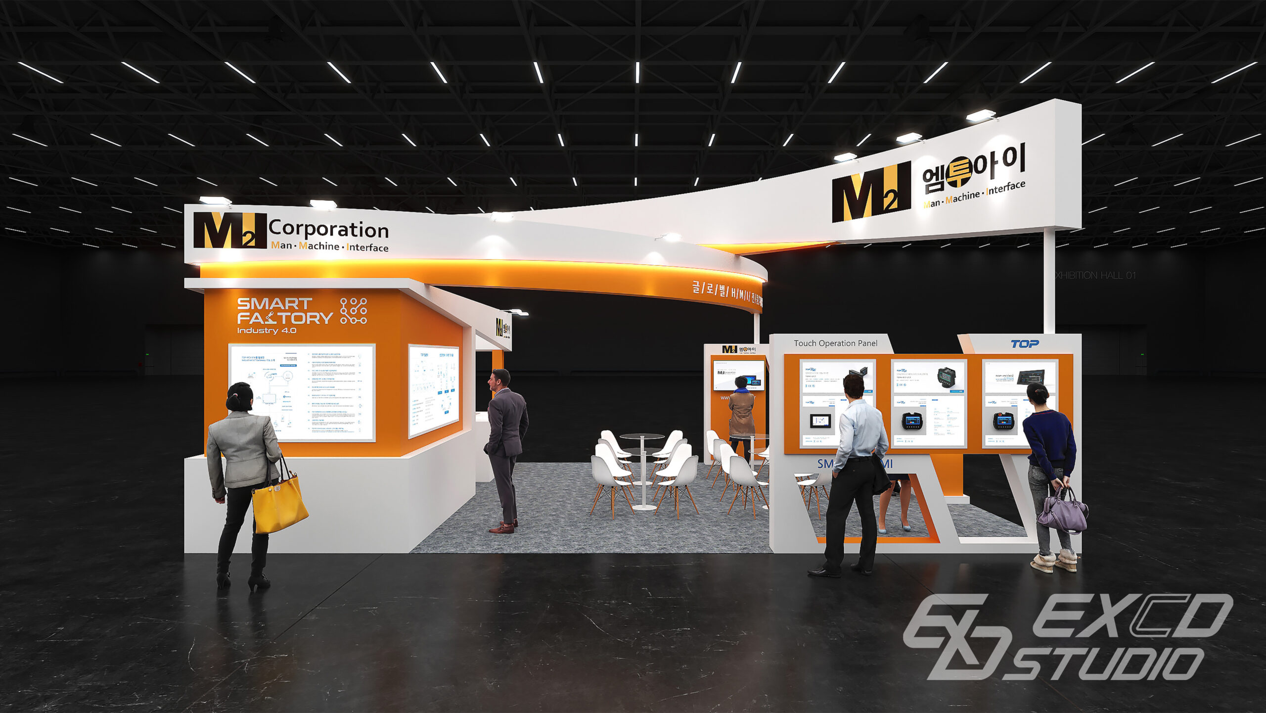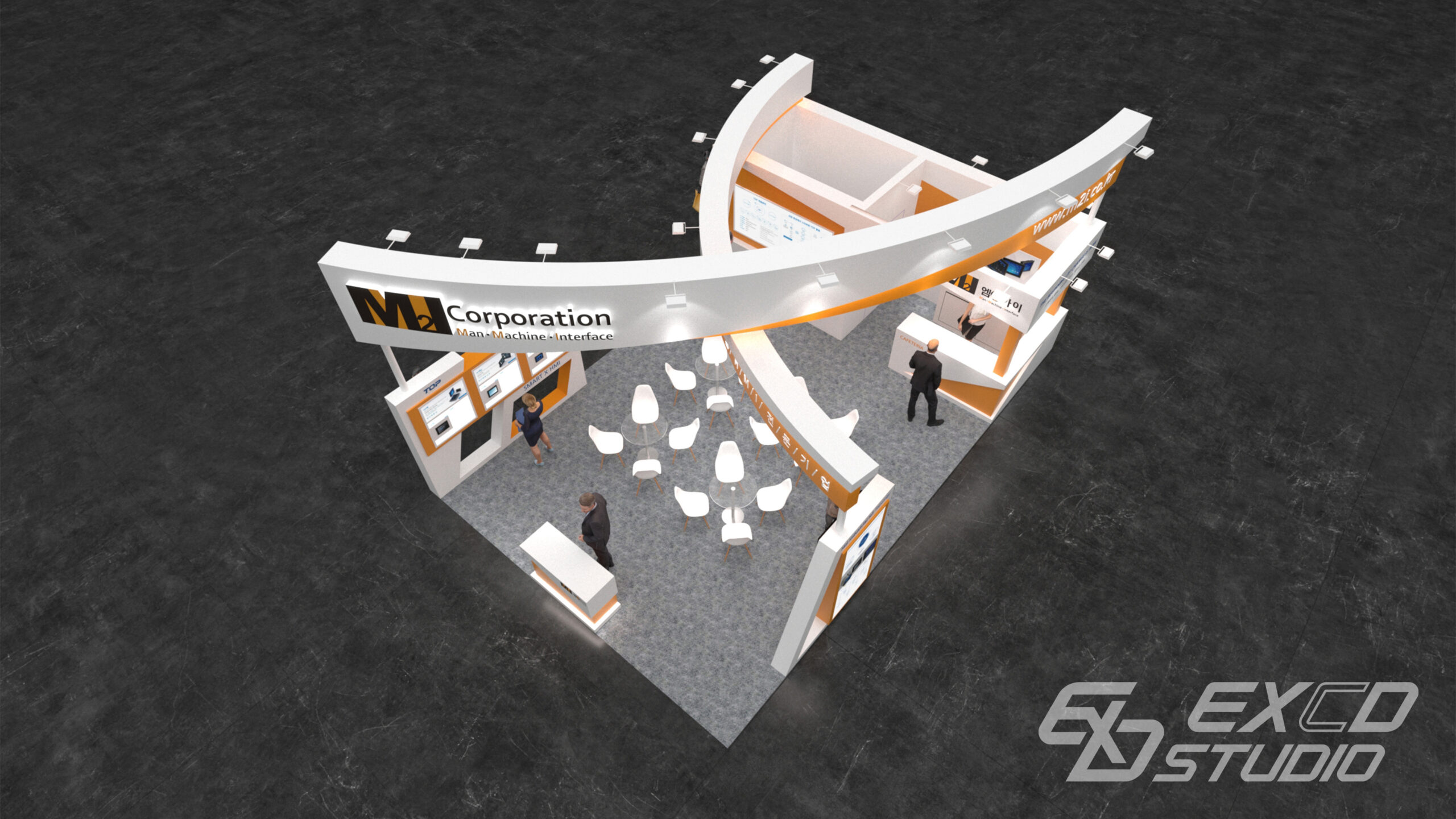 곡선 요소를 상부 구조물에만 적용하여 부스 중앙에서 교차하는 두 개의 구조물을 계획했습니다. 이를 통해 방문객의 시선이 자연스럽게 부스 내부로 향하도록 유도하고 전시 공간은 외곽에 상담 공간은 중앙에 배치하여 동선을 분리했습니다.